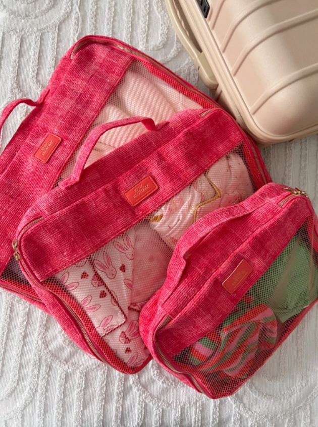 Our 3-Piece Packing Cubes Set are your new favorite travel companion, making packing and unpacking a breeze! Make it matching with the Coral set and pair it with the Vacay L and Bikinis XL! Thick chenille material with mesh fabric fronts for easy visibility and organization while keeping secure closure and breathability.