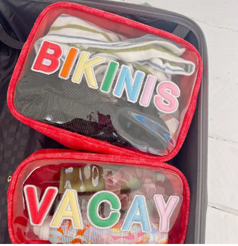 Our favorite XL for throwing in wet bikinis or using as packing cubes for your next vacay! Make it a matching set and pair it with the Vacay M & 3-piece packing cubes! Clear one one side for easy access and visibility Coral chenille with rolled multi-colored patches sewn on.