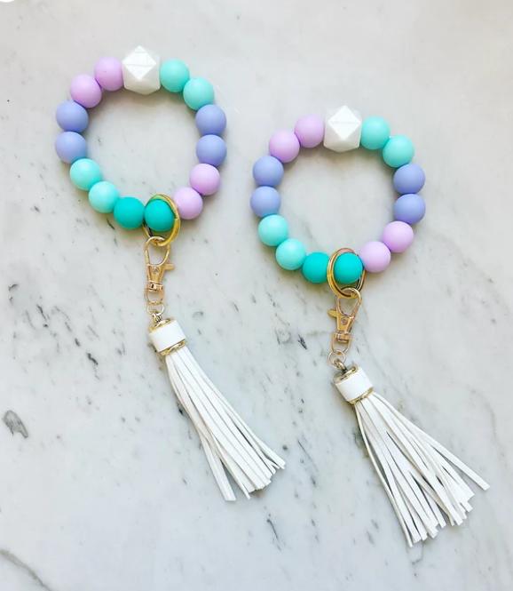 The wristband keychain is made with 14 15mm silicone beads, 1 15mm gold wooden bead, split ring, clasp, and leather tassel. The wristband keychain makes it easy for you to have your keys and wallet attached to your wristband, which easily slides onto your wrist! The wristband is made with elastic, so it will not fall off your wrist!