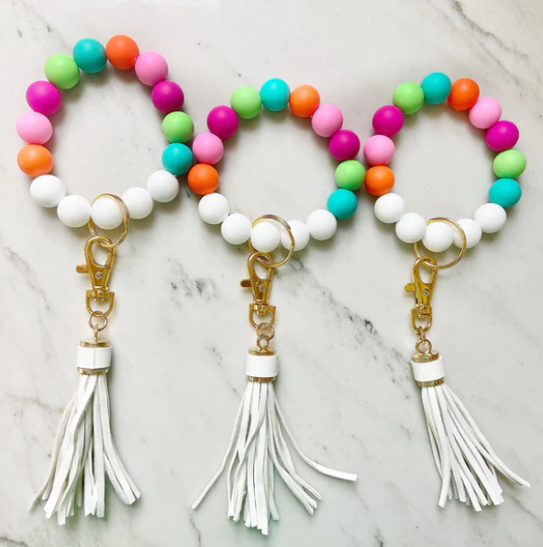 The wristband keychain is made with 14 15mm silicone beads, 1 15mm gold wooden bead, split ring, clasp, and leather tassel. The wristband keychain makes it easy for you to have your keys and wallet attached to your wristband, which easily slides onto your wrist! The wristband is made with elastic, so it will not fall off your wrist!